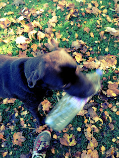 He picks up a big bottle of water that is just in the grass and carries it along. I laugh to myself that he thinks I maybe thirsty. Such a clever dog!